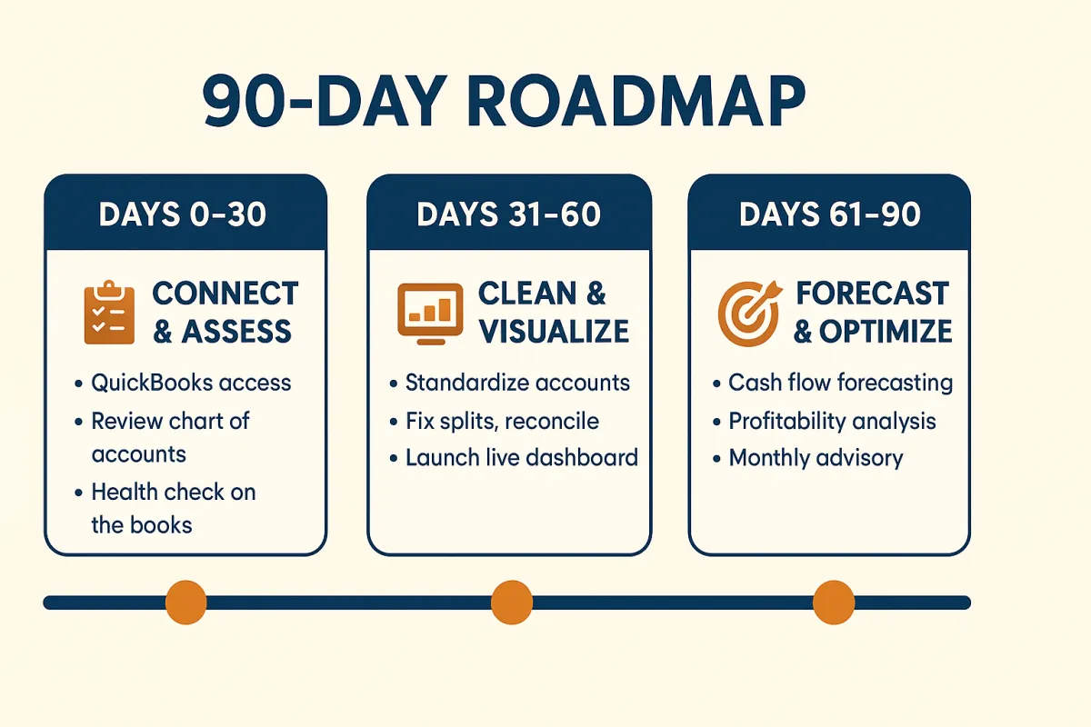 QuickBooks access + a brief intake on your model (splits, teams, lead sources). We run a health check on the books.